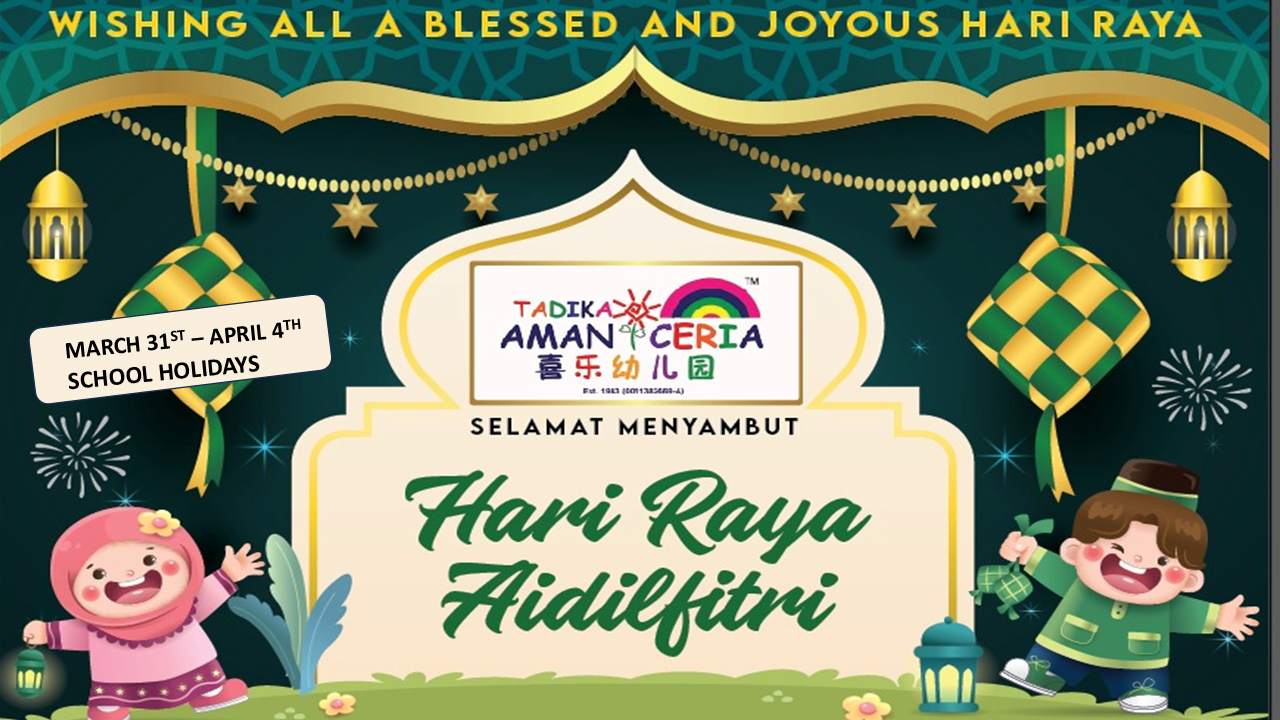 Wishing all our Muslim parents, families, children, staff and friends 'A blessed and joyous Hari Raya Aidilfitri' Let us embrace the festive occasion of Hari Raya and celebrate with great zeal and joy.