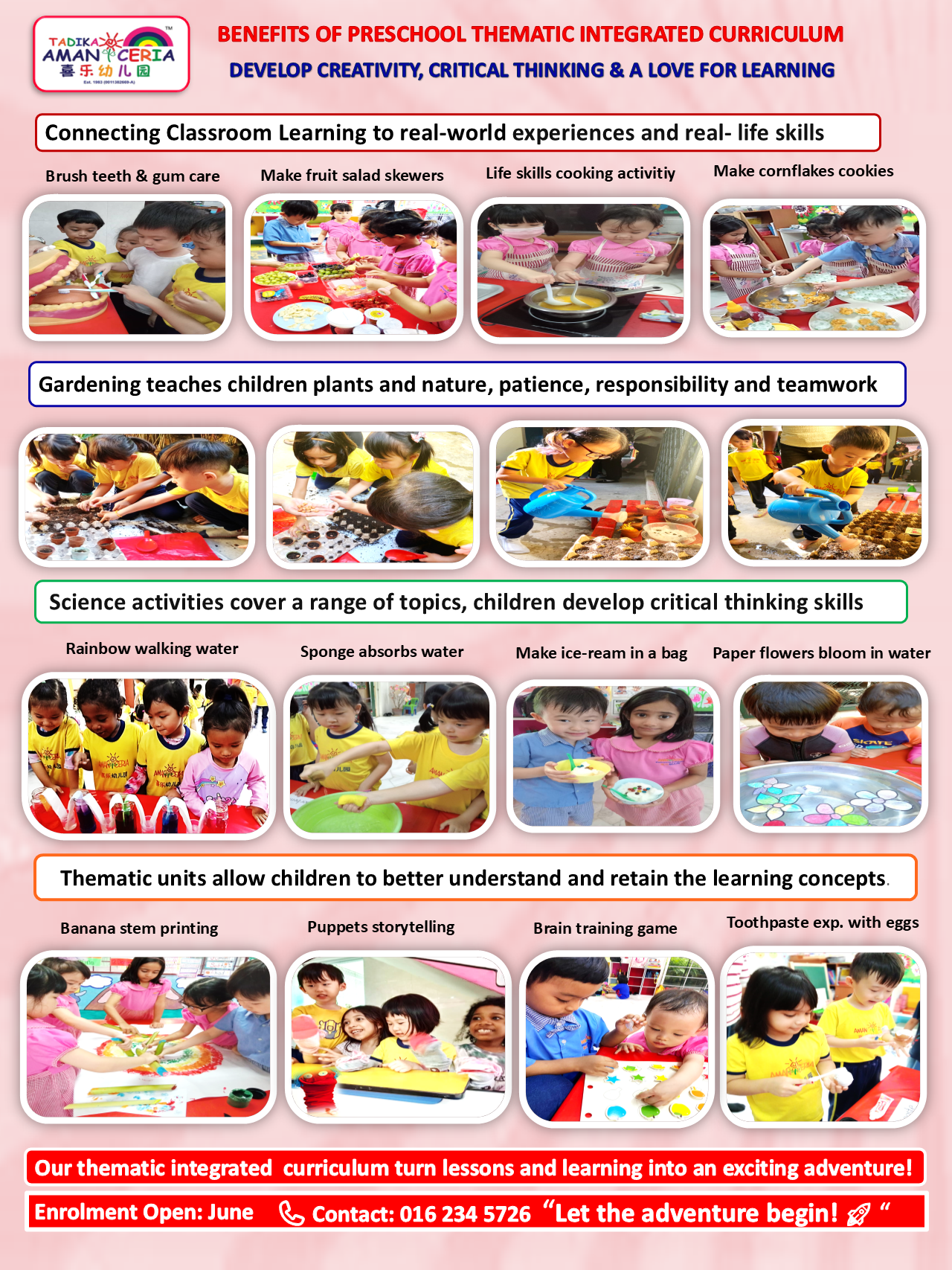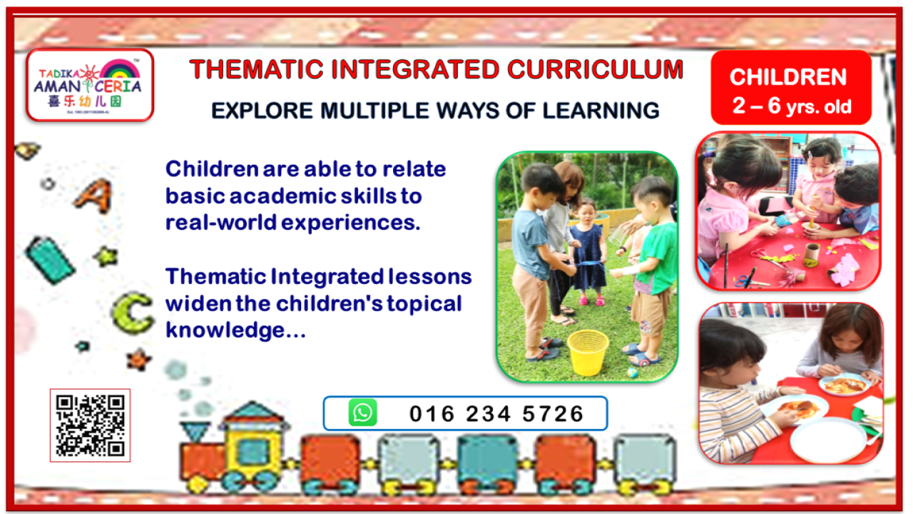 At Tadika Aman Ceria we believe in nurturing our children through an integrated thematic curriculum aims to connect the theory learned in the classroom, with practical, real-life knowledge and experiences. Designed to spark curiosity and foster holistic development, our thematic curriculum sets the foundation for lifelong learning.
