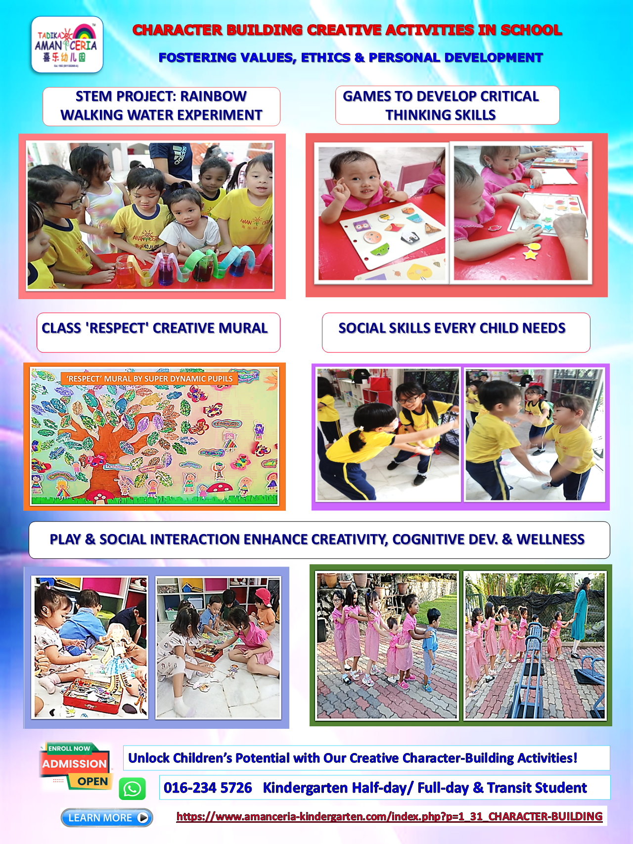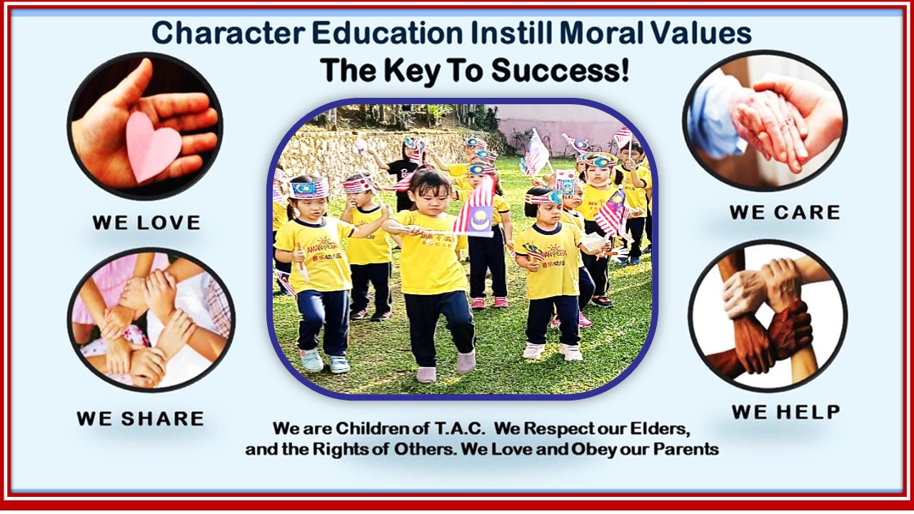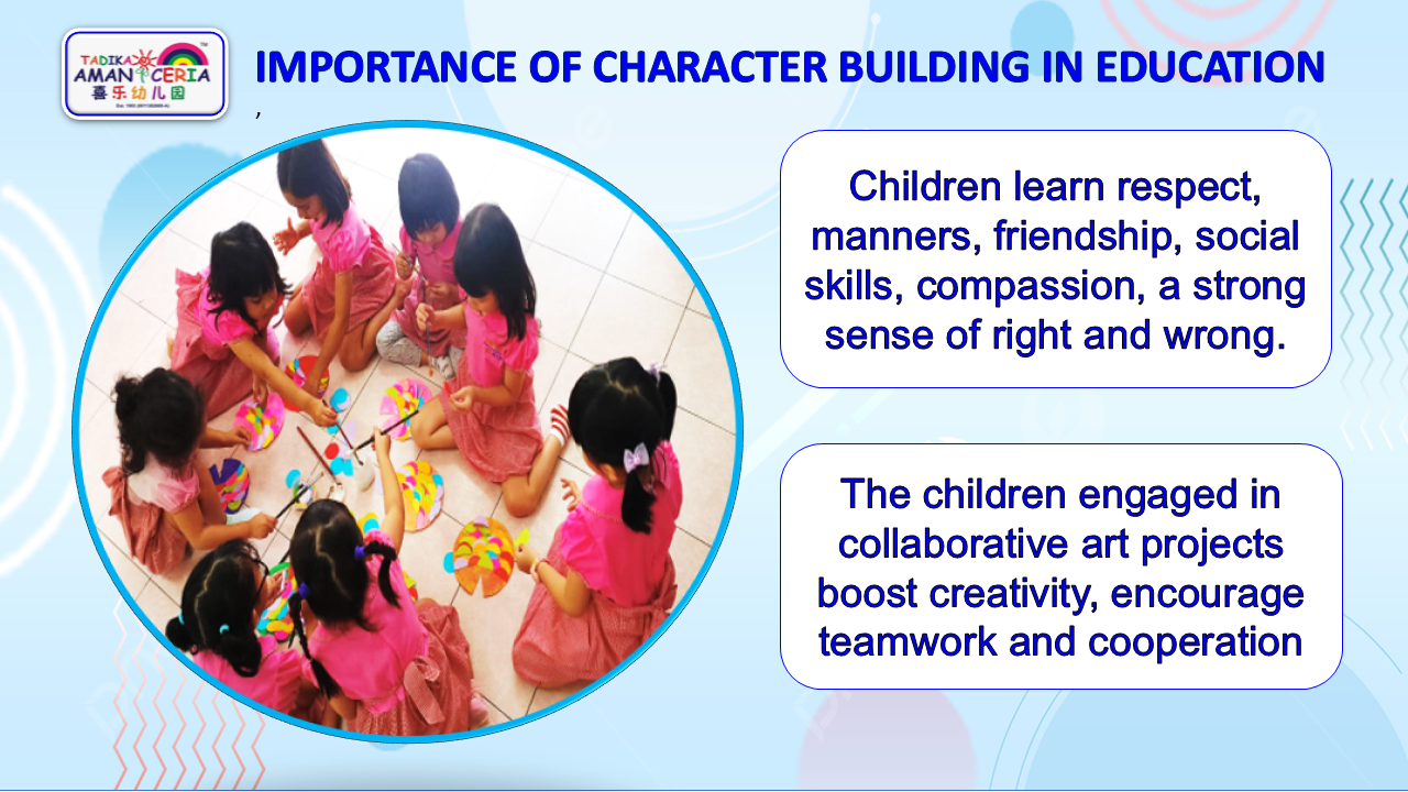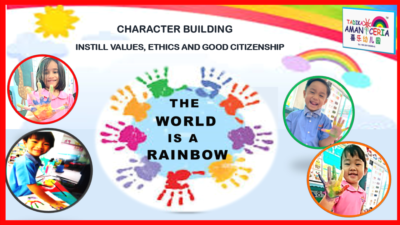 Tadika Aman Ceria builds strong foundation that encompasses cultural, social, aesthetic, physical and character development of children. Character education is incorporated into our daily curriculum, teaching children about core ethical values such as respect, caring, kindness, resilience, good citizenship, responsibility to self and others.
