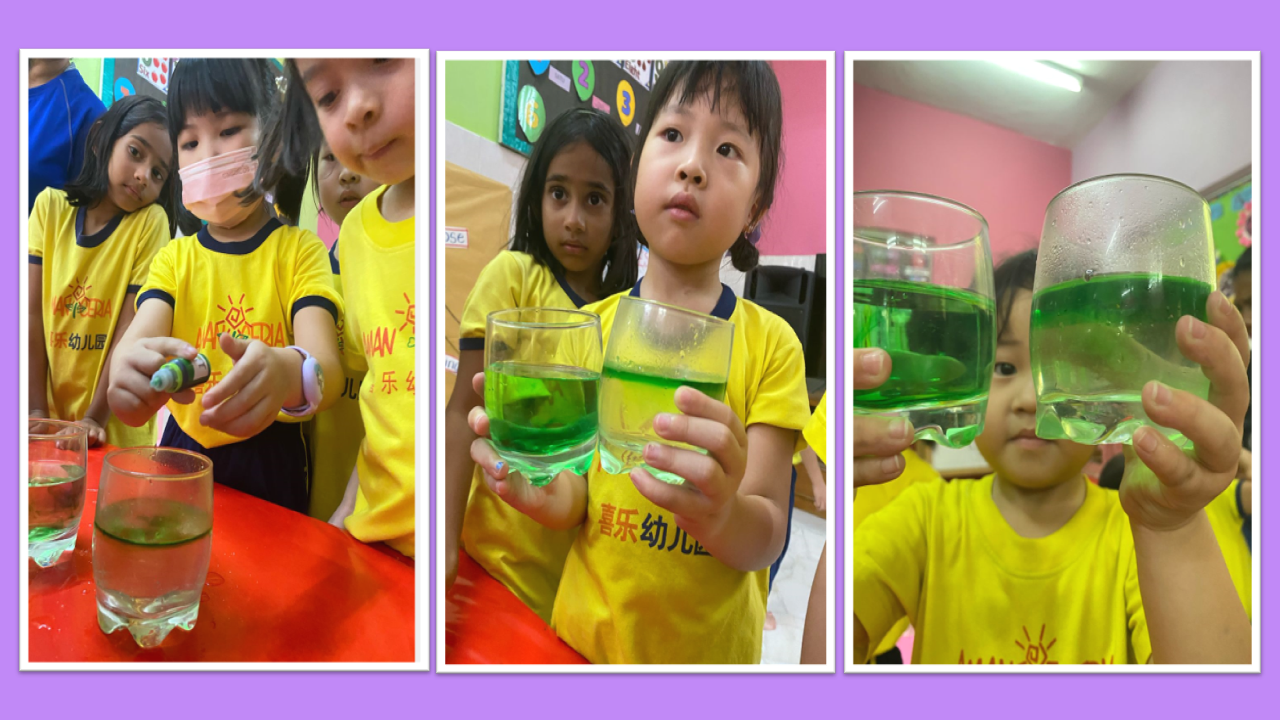 STEM activities: Salt water and food coloring experiment encourage cooperative learning and team building. [Salt water is denser than plain water, causing the colored plain water to float on top of the salt water, creating a layered effect]
