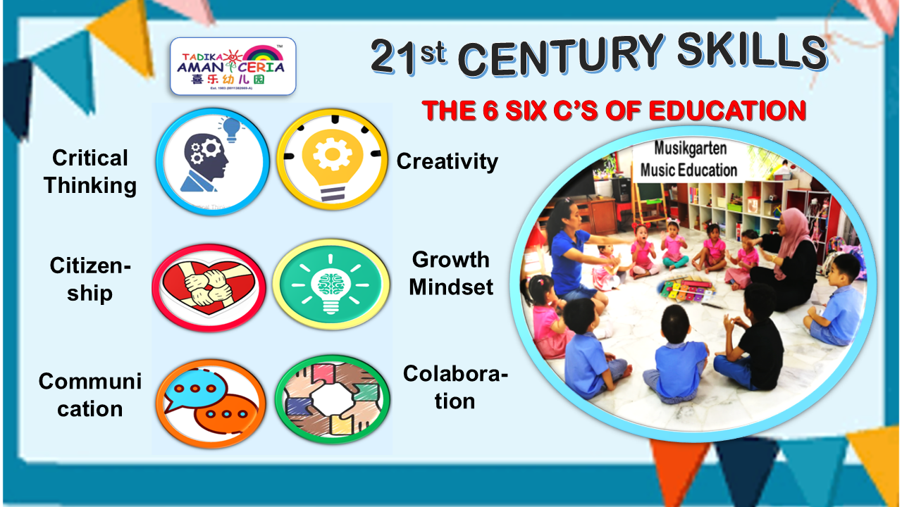 Children learn the core subjects— languages, B.Malaysia, English, Mandarin, Math, Science, Social Studies, Arts and enhanced by incorporating "6 C's" critical thinking communication, collaboration, creativity, character, and citizenship.